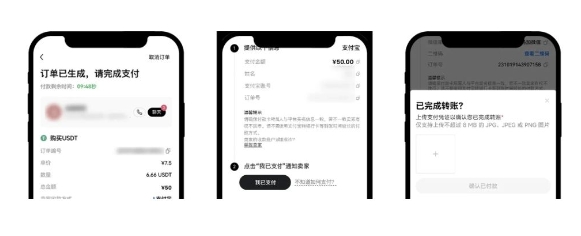 (2)订单生成后,确认订单信息,如果您对订单信息有疑问,可以点击【取消订单】:如果信息无误,请点击【订单详情】。请及时打开手机银行 App/ 支付宝/微信,输入对方账户信息进行付款。请务必在完成付款之后,再点击【我已支付】。对方核实款项后,您所购买的数字资产就会发放给您。新手用户买币成交<3单时,点击【已支付】后,页面将出现弹窗,需要您上传付款证明。