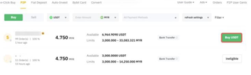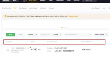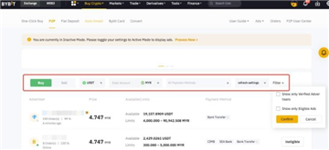 2、在买币页面,您可以根据交易需求输入所需币种、金额、法币、付款方式等条件,筛选广告方。