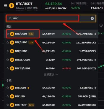 8、进入页面后,搜索BTC,选择BTC/USDT交易对,可以看到西昂管的市场行情以及交易页面