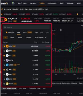 5、注册完成之后,返回首页在页面左侧,将鼠标悬停在交易对旁的下拉选单上,即可查看支持的所有现货交易对,以及相应交易对的最新成交价和 24小时涨跌幅。