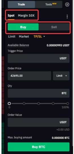 6、如需快速查找某个交易对,请在搜索框直接输入要查看的交易对。要进行现货交易,请确认您当前已打开现货选项卡。然后,选择买入