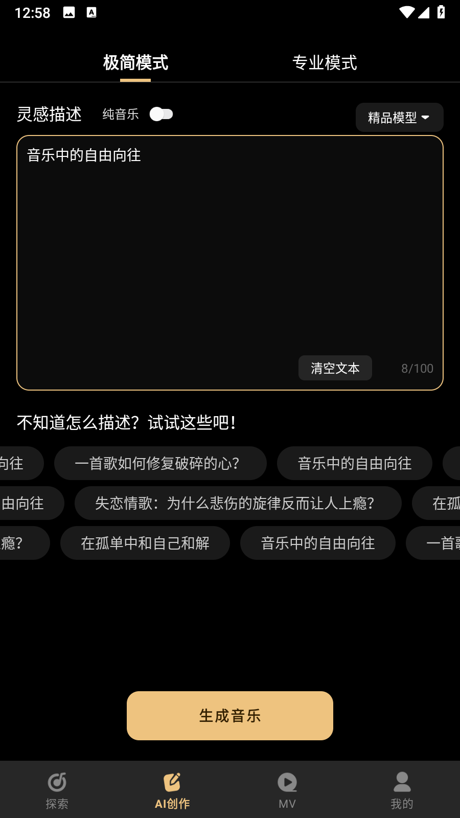 1、打开软件后即可进入创作页面,可以输入作品的关键词或者灵感线索,然后点击下面的生成音乐。