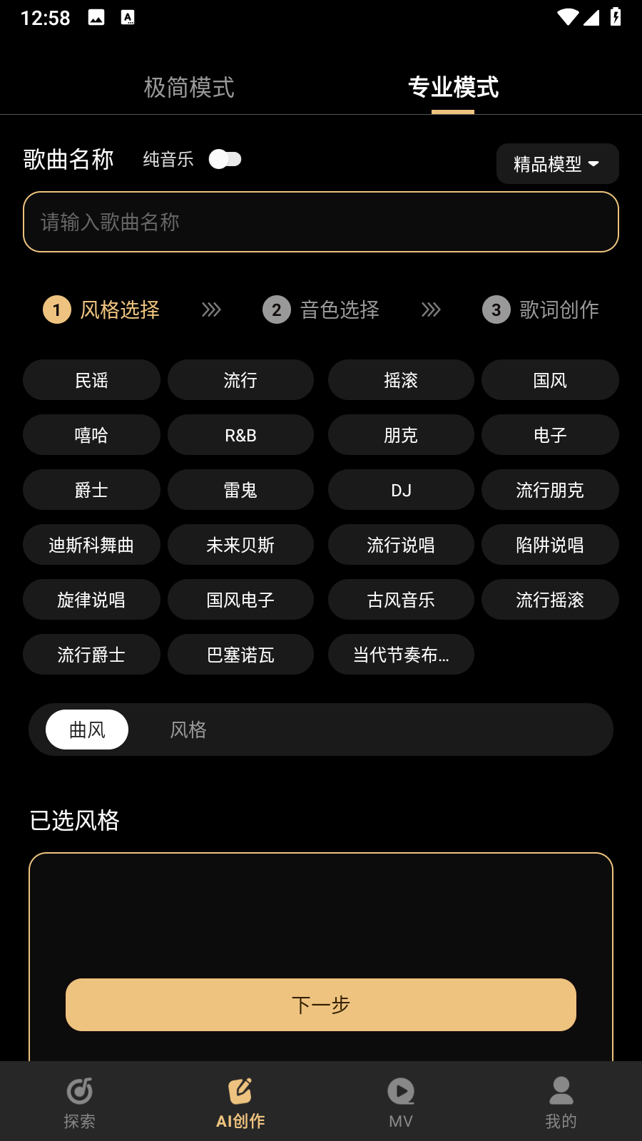 自由选择风格,AI自动匹配编曲逻辑,充分展现你的个人音乐品味。