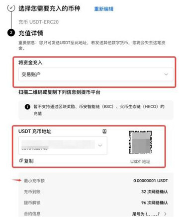 3、在充币详情页,选择【将资金充入】的账户一【复制地址】