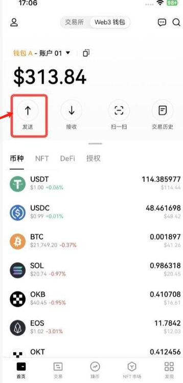 4、打开Web3钱包首页,点击发送,选择您想要充值的币种;