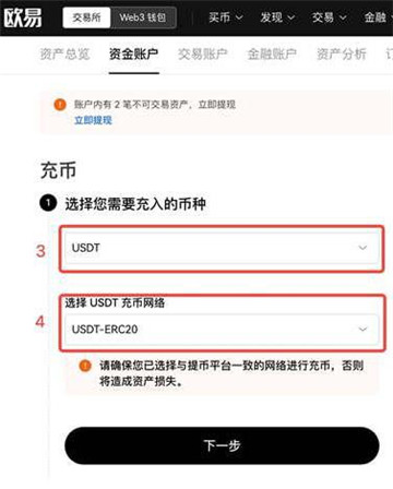 2、选择您需要充入的币种【USDT】—选择USDT可用的充币网络【USDT-ERC20/USDT-TRC20/USDT-OKTC】一【下一步】;注意:选择充值USDT币种时,此地址只能充入Tether(USDT),请勿充入其他币种,否则您充入的资产将无法找回。