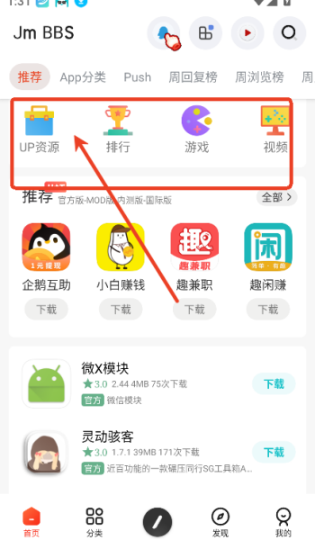 1、打开app首页,提供up资源,游戏,排行,视频等多个板块的内容。