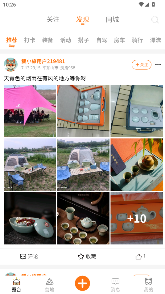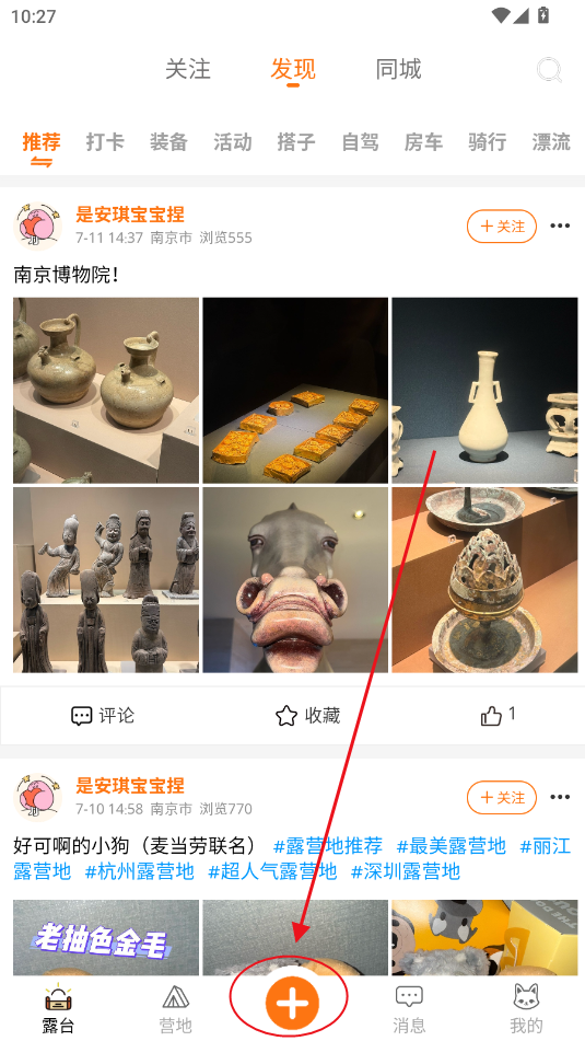 4、点击 “记录” 功能,上传图片、文字记录露营生活,发布后可与他人分享。