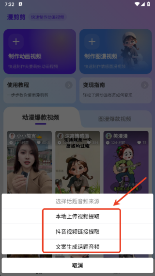2、选择话题音频来源,有从本地上传视频提取、抖音视频链接提取、文案生成话题音频功能;