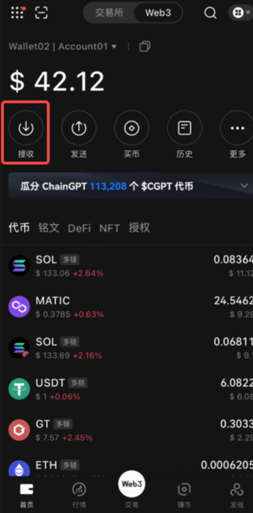 第一步:打开RWA交易所app,进入Web3界面,点击页面中【接收】