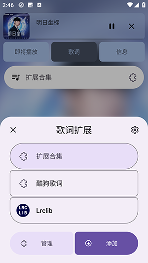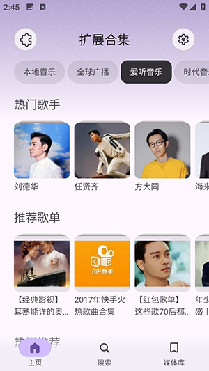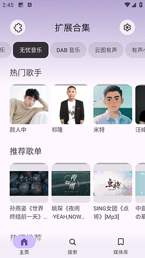 •通过添加音乐类插件,可获取丰富音乐内容,包括热门歌手、精选歌单和完整专辑推荐。