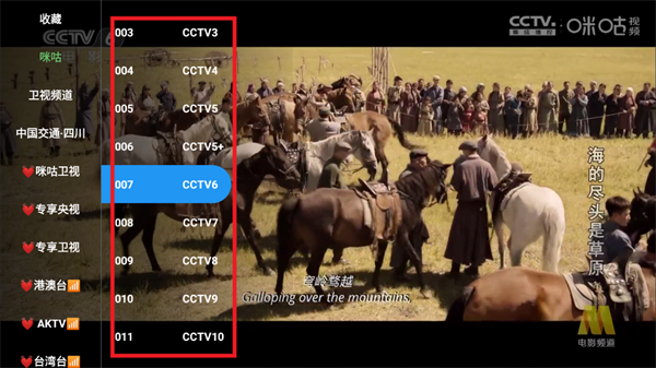 2.点击频道,左侧弹出电视直播频道栏。