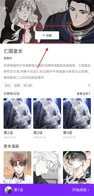 1、通过分类或是搜索的方式来找到感兴趣的作品,并点击进入,可以看到作品主页上方有个“+收藏”,点击即可加入书架
