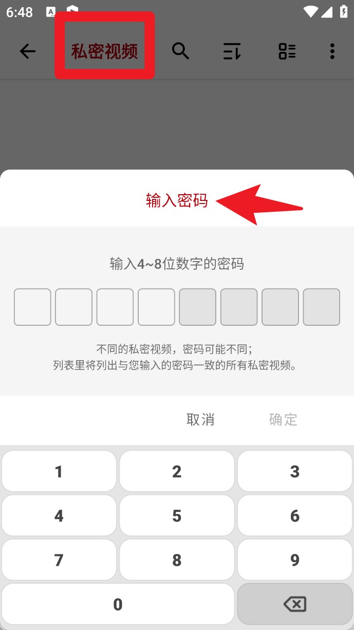 3、若需隐藏影片可点击「私密视频」功能,设定4~8位密码后进入加密列表。