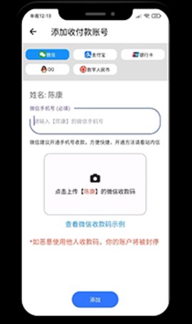 支持微信、支付宝、银行卡、QQ钱包、数字人民币等账号,用于方便的收付款操作。