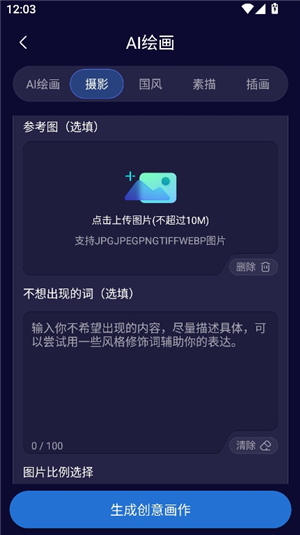 3、还能添加参考图与禁止词,然后点击下方的生成创意画作就可以了。