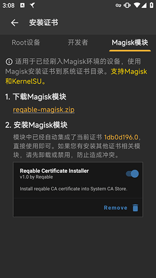 2、怎么root自己的安卓设备,用户可以根据自己的技术习惯或者是在百度上自行查找,然后按照官方app中也给出了相关指导进行证书的安装,如下图所示。