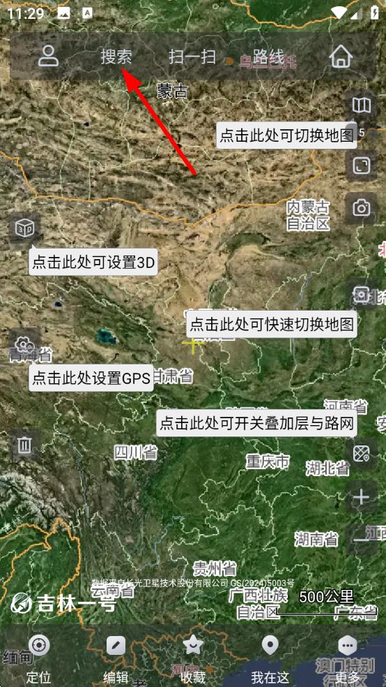 1、打开奥维互动地图,点击上方搜索按钮,进入搜索相关界面。