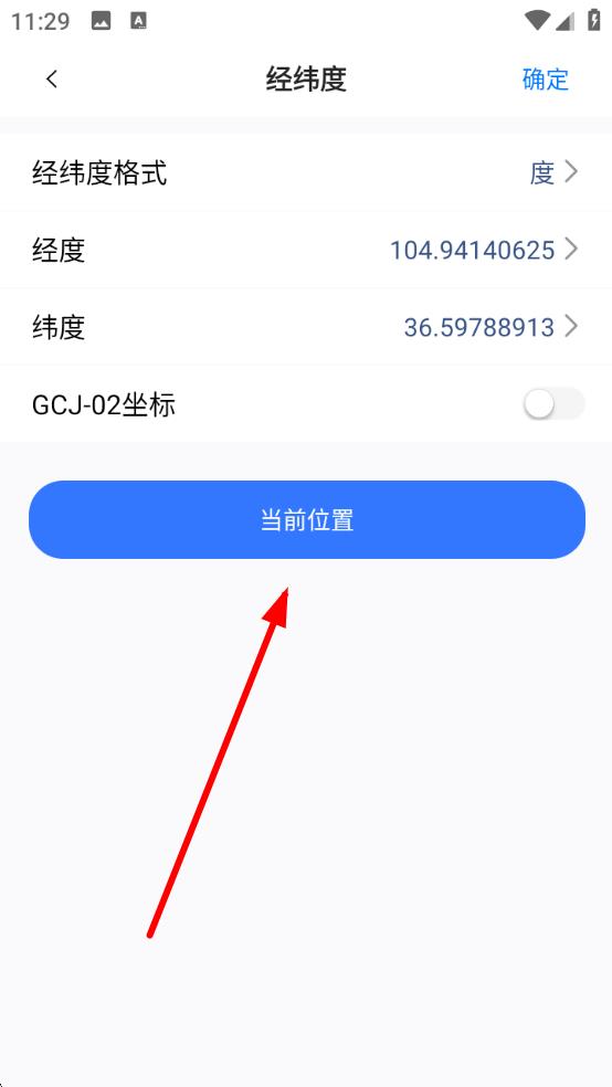 3、在经纬度界面里,点击当前位置按钮,即可获取并定位当前所在位置的坐标。