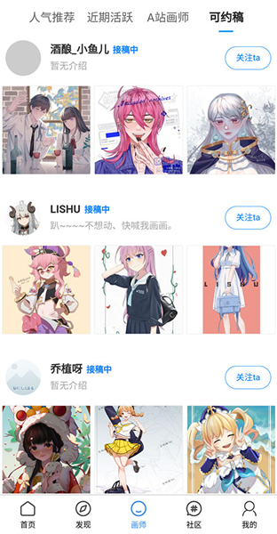 1、可以关注自己喜欢的插画师,并与其他用户进行互动。此外,插画世界还支持向画师约稿,定制专属插画作品。
