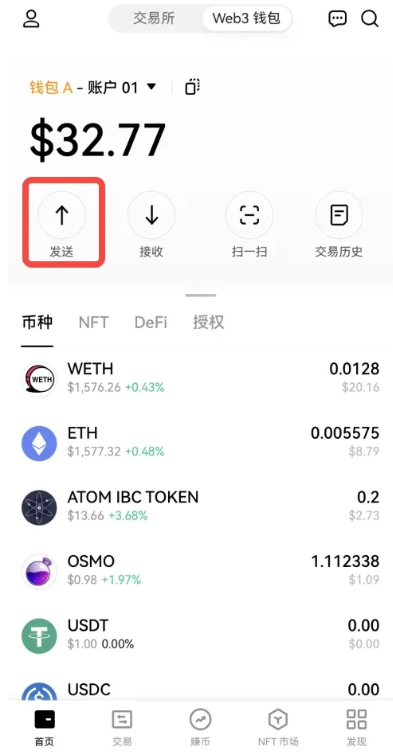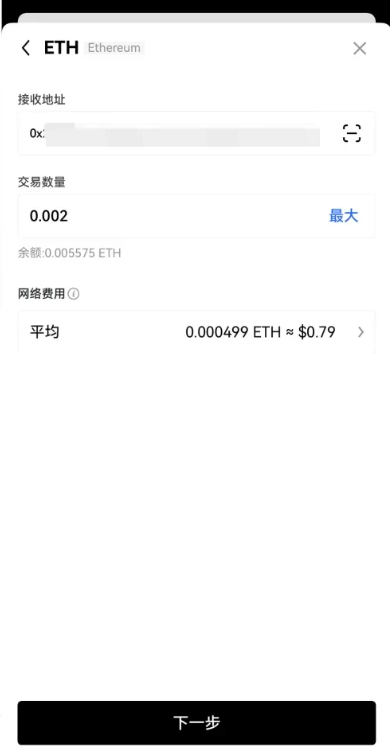 选择要进行转账的钱包和账户,如钱包 A -账户 01,以 ETH 为例,点击发送,输入接收地址和数量,默认网络费用为平均,点击下一步并确认。