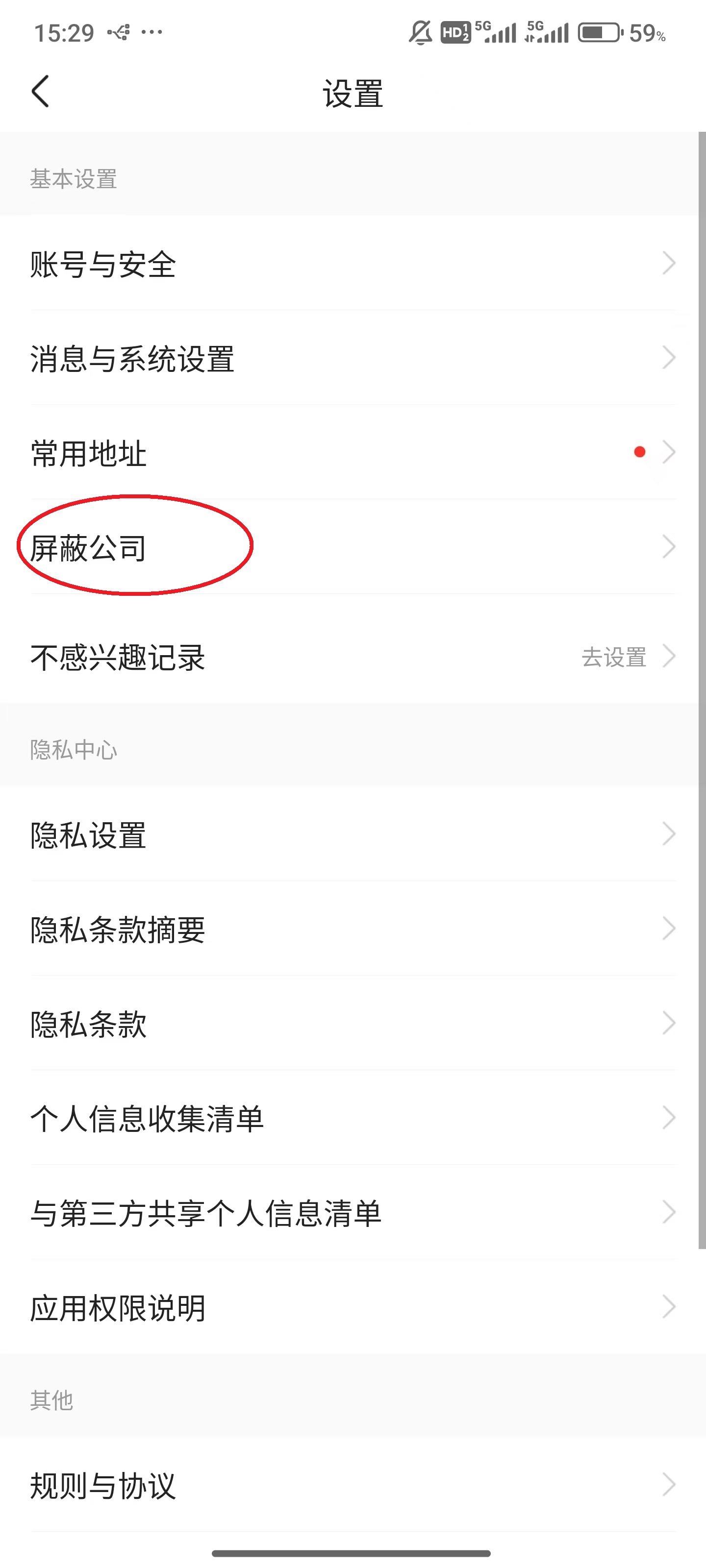5、随后选择屏蔽的公司,点击屏幕下方的“屏蔽”。