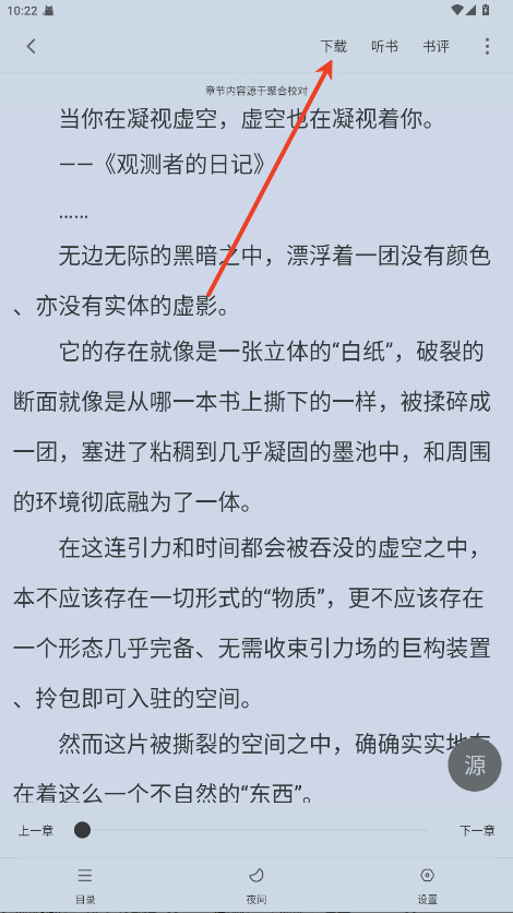 1.打开追书大师app,进入阅读界面后,点击右上角的下载按钮