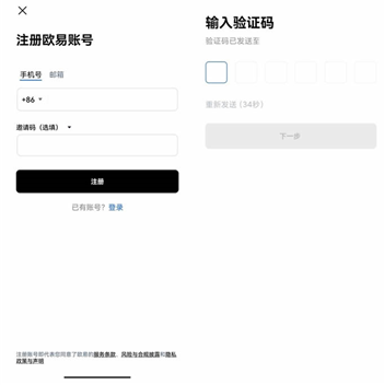 1、打开欧易APP,点击注册账号注册分为手机号注册和邮箱注册两种方式,您可以自由选择注册类型,然后按照要求填写完整相应信息即可完成注册。