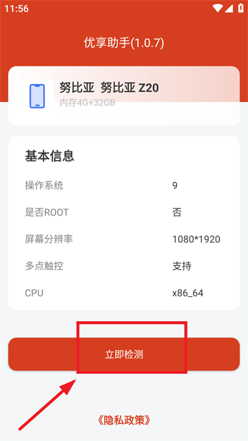 在本站下载安装并打开优享助手app,点击立即检测