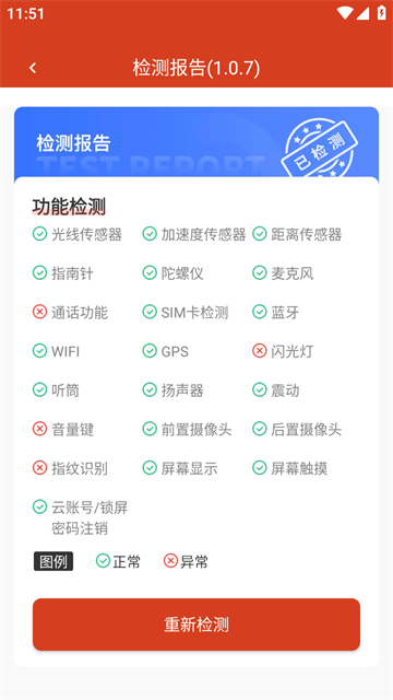 在检测过程中,一旦发现软硬件异常(如屏幕坏点、麦克风失灵、陀螺仪故障等),系统将立即高亮提示,问题一目了然。