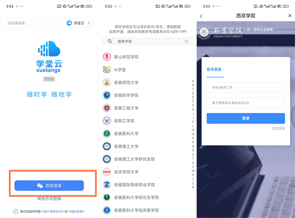 1、支持微信登录。点击微信登录,搜索栏中输入:“西京学院”进行绑定。