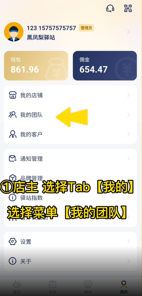 1、店主需要点击下方导航栏中的【我的】,然后点击【我的团队】;