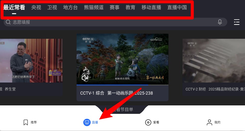 2、切换至“直播”频道,可观看CCTV各频道及地方台实时直播,支持分类筛选和节目的快捷点播。