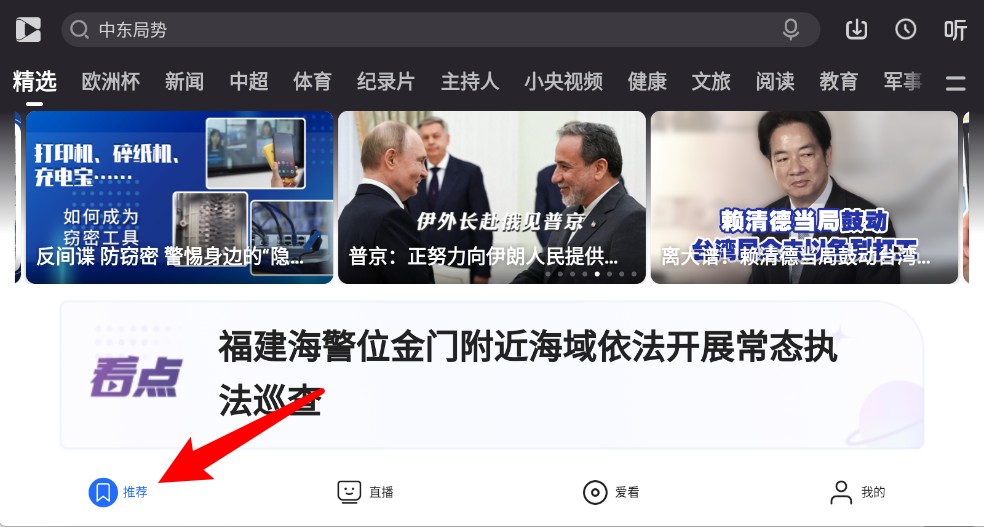 1、首页默认进入“推荐”频道,可浏览央视热点资讯及各类专题内容,点击左下角图标即可快速回到推荐页。