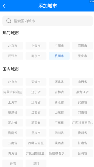 3、今日添加城市界面,可以直接搜索国内城市,也能直接在下方的城市中选择。