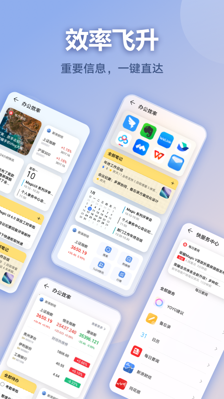 荣耀快服务中心app官方正版是荣耀Magic UI/OS系统深度定制的服务卡片聚合平台,专为荣耀用户设计,通过智能整合系统级服务与第三方应用功能,以“卡片化”形式将高频操作、重要信息直观呈现于桌面或负一屏。用户无需打开多个应用,即可快速完成日程管理、生活缴费、资讯浏览等操作,真正实现“零层级交互,一键直达需求”。目前仅支持Magic UI 6.0及以上版本(对应MagicOS 6.0-7.0)的荣耀手机用户使用。