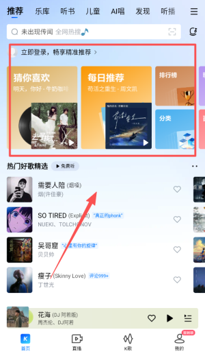 1、打开软件后可以在首页推荐发现热门歌曲,或直接点击顶部搜索框输入歌名歌手快速找到想听的音乐。