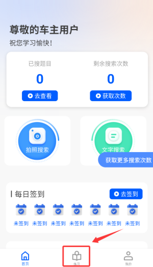 1、启动学法减分高手APP后,在首页功能栏选择"练习"模块,进入学习界面。