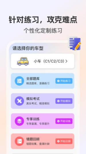 1、车型适配题库,内容精准无冗余:支持车主自主选择车型,系统匹配对应准驾车型的专属题库,覆盖该车型高频考点(如客车安全驾驶、货车装载规定等),避免通用题库的内容杂乱问题,学习更具针对性。