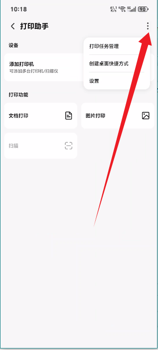 7、点击主界面右上角三点,可进入打印任务管理、创建快捷方式或设置页面。