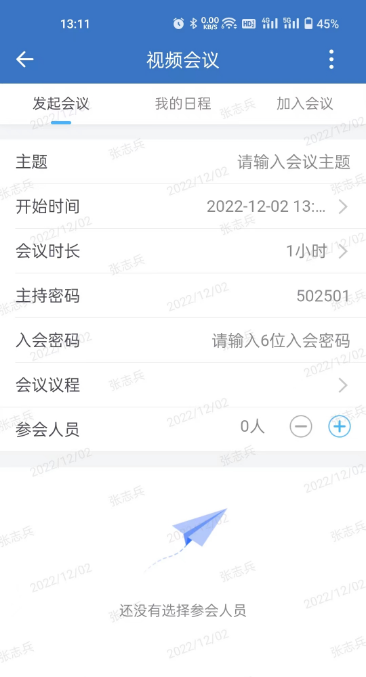 参会人员:点击“+”显示通讯录,选择参会人员。(至少选1人)(必填)