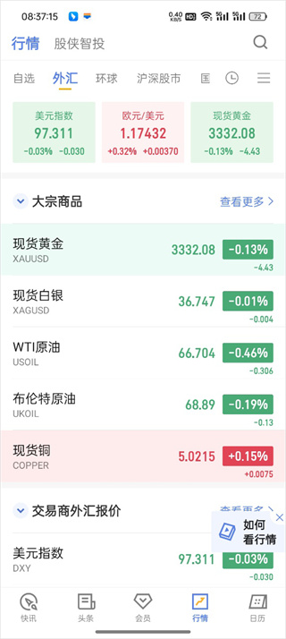 3、选择外汇、股市等不同的栏目,你可以查看最新的走势。
