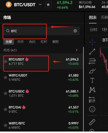 5、在搜索框输入BTC,选择BTC/USDT交易对,可以看到BTC实时行情