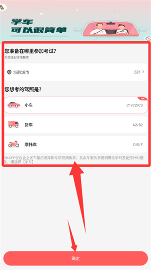 1、启动应用后选定所在城市与驾照类别,点击确认完成匹配。
