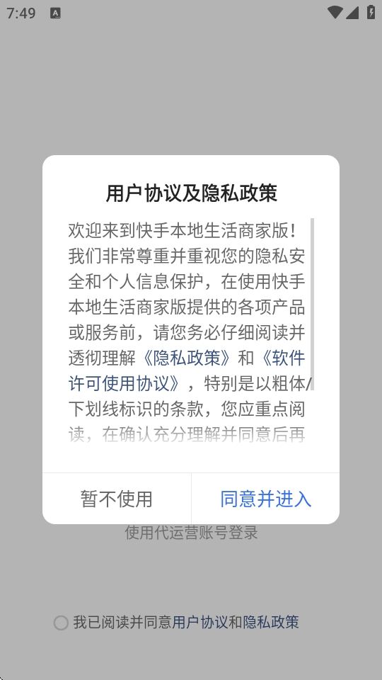 1、在本站下载并打开快手本地商家app,阅读用户隐私协议之后点击“同意并进入”;