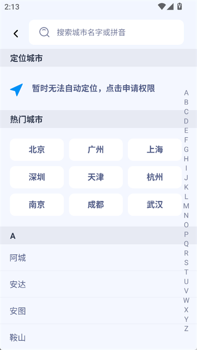 2、点击手动选择城市,进入城市选择界面,用户可以查看想要了解的城市;