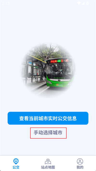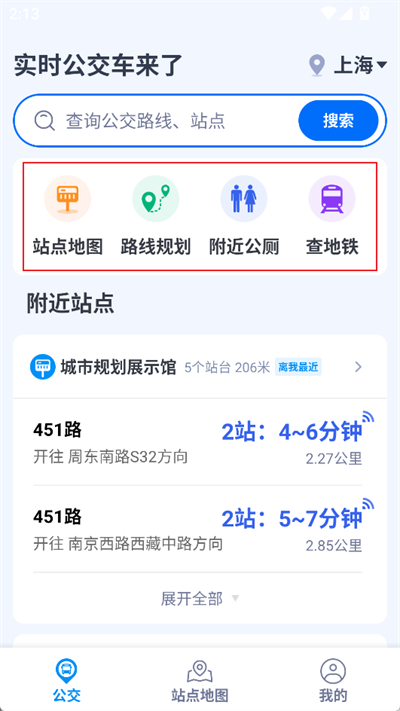 3、选择城市后,在首页的位置即可为你展现附近的站点,上方还有站点地图、路线规划、附近公厕以及查地铁等服务;