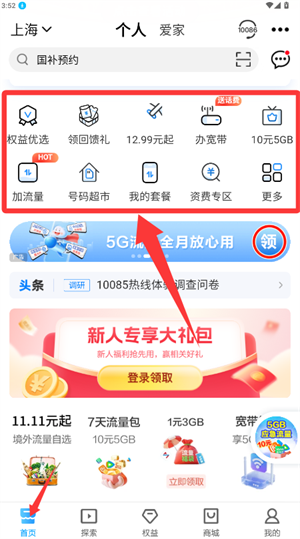 2、返回应用首页,在功能区域点选权益优选服务入口。