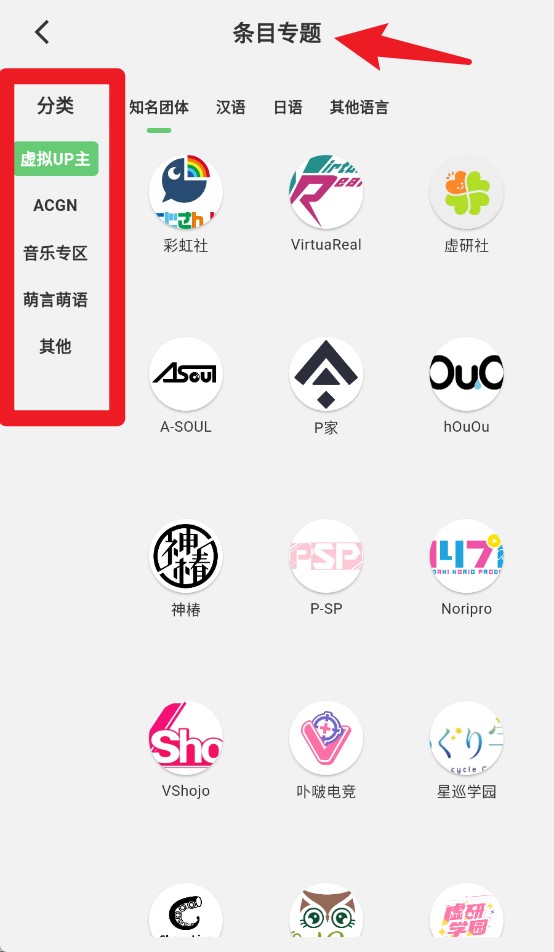3、在“条目专题”中可分类查看各类虚拟UP主与相关社团资料。