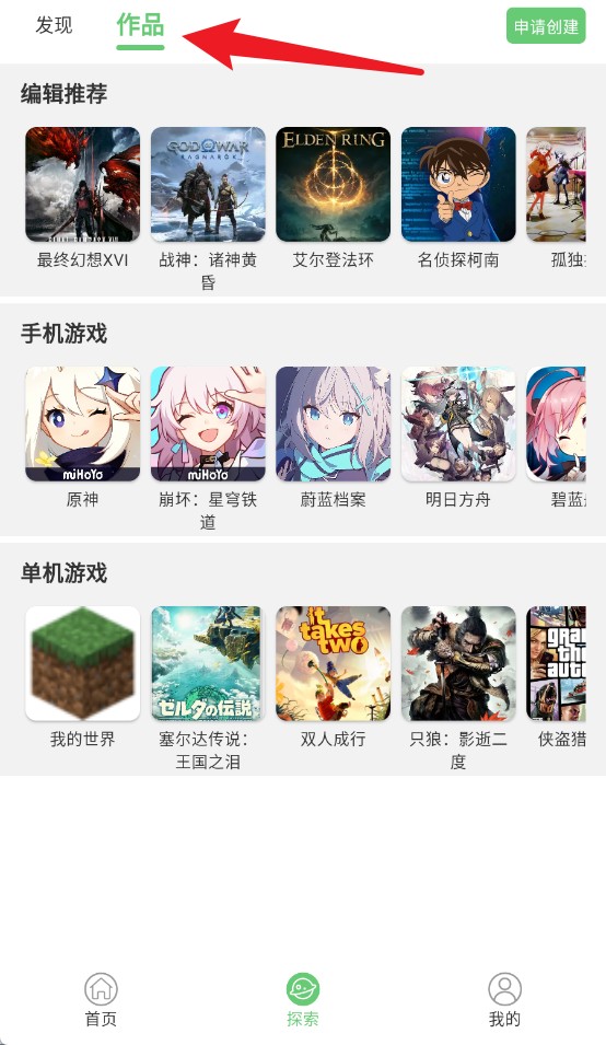 4、切换到“作品”页即可浏览编辑推荐与热门游戏资源集合。